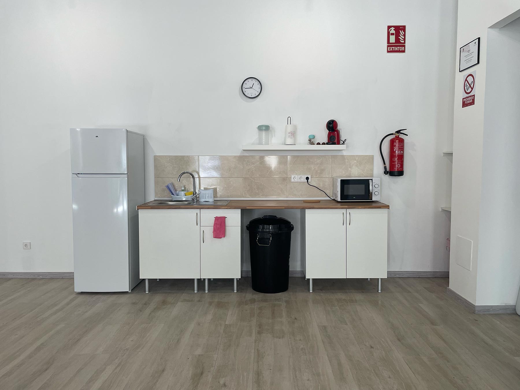 Zona de cocina con frigorífico, microondas, cafetera Dolce Gusto, sandwichera, horno de sobremesa, hervidor de agua para infusiones y cubo para refrigerar bebidas con hielos.