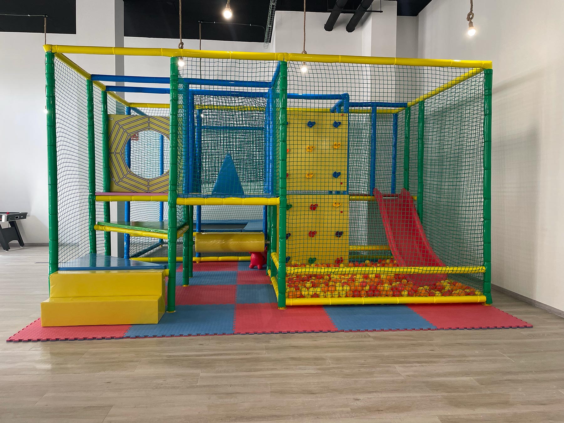 Zona infantil con nuestro parque de bolas de 17 m2 de dos pisos y rocódromo de 2,8 metros de altura para 25 niños, donde tendrán la diversión asegurada.